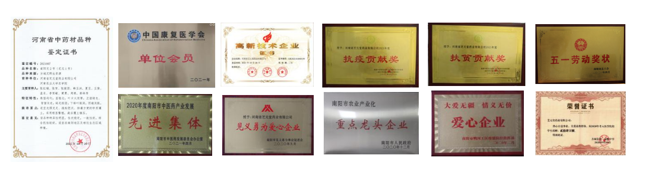 (1)“南阳艾2号(芝元1号)”艾草新品种获批;(2)医圣扶阳灸智能艾灸设备获得第十届中国创新创业大赛河南赛区优秀奖;(3)南阳市首批饮片级艾条艾柱生产许可企业;(4)中国康复学会高级单位会员;(5)南阳市中药材加工行业协会副会长单位;(6)南阳艾草产业协会副会长;(7)南阳艾产业学院理事会副理事长单位;(8)2020年度南阳市中医药产业发展先进集体;(9)2021第四届中国艾产业发展大会爱心企业;(10)2021第四届中国艾产业发展大会暨世界艾乡(南阳)灸法论坛优秀参展企业;(11)南阳市中医药文化宣传教育基地;(12)芝元堂药业康养基地初步通过验收;(13)河南省高新技术企业;(14)智能艾灸设备二类医疗器械,2022年可取得二类医疗器械许可证。(15)芝元堂药业发展情况及公益举动被多家媒体争相报道。