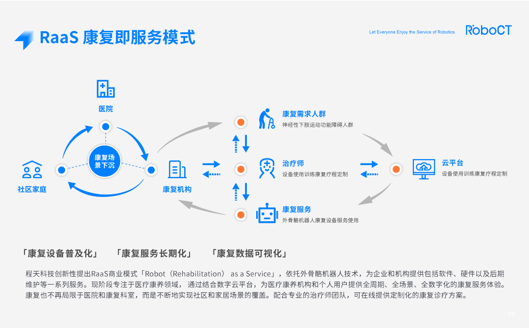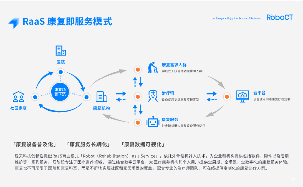 程天科技的康复云平台以康复大数据为支撑,通过康复知识图谱的建立,推动实现远程康复指导??蹈丛破教筛哺且搅瓶笛苟?、医师治疗师端以及用户端,可就用户日常生活能力、主被动训练变化对比、设备投放和活跃情况进行实时监测展示。截止目前,程天科技自研自产的康复外骨骼通过“康复即服务”模式,已经达成全国超700+医疗机构合作,服务40万+人次。