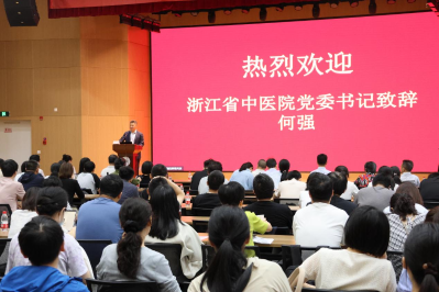 6月7日开幕式上,浙江中医药大学附属第一医院(浙江省中医院)党委书记何强致辞。