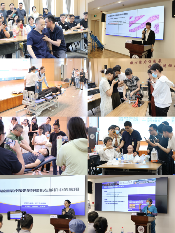 学习班首日开设五场工作坊。中国康复研究中心苏国栋、黄富表,中山大学附属第三医院万桂芳,南部战区总医院重症康复中心古菁、邢然然,浙江省中医院西溪院区蔡丹莉等专家领衔,通过“理论讲解+实操指导”模式,系统培训重症PT、OT、ST技术及基础抢救技能。浙江省中医院张志荣团队现场演示气管插管、支气管镜操作,石莹团队解析呼吸机应用与撤机技术,帮助学员提升临床操作能力。