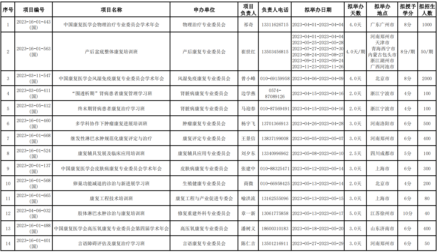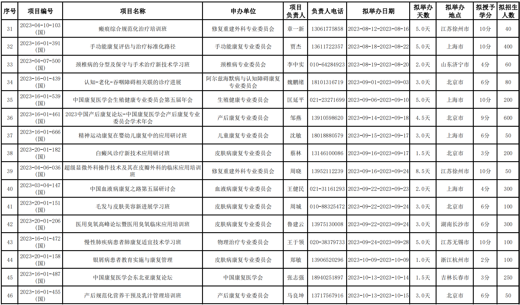 现将全国继续医学教育委员会办公室批准的我会2023年第二批国家级继续医学教育项目(备案项目)予以公布,为进一步规范继续医学教育管理,提高继续医学教育质量,根据《国家卫生健康委办公厅关于进一步加强培训班管理的通知》(国卫办人函﹝2022﹞43号),按照《国家级继续医学教育项目申办要求》《中国康复医学会学术活动管理办法》《中国康复医学会继续医学教育项目管理办法》《中国康复医学会分支机构财务管理办法》,请认真组织实施,并按以下要求抓好落实。