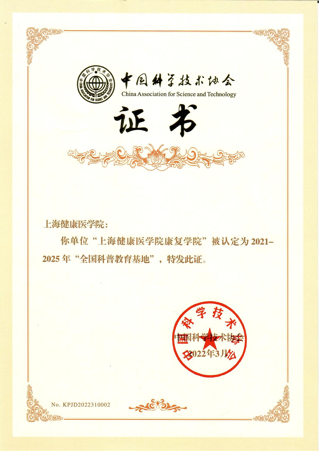 上海健康医学院(康复学院)成功入选中国科协2021-2025年第一批全国科普教育基地
